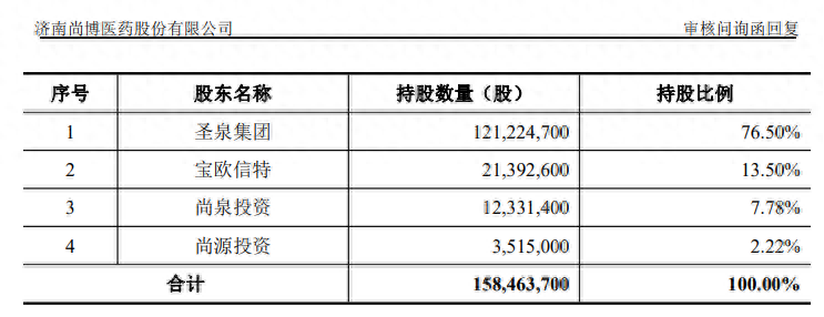 经济导报记者查询获悉,截至目前,尚博医药共有四名股东,分别为圣泉集团(持股76.50%)、宝欧信特(持股13.50%)、尚泉投资(持股7.78%)和尚源投资(持股2.22%)。