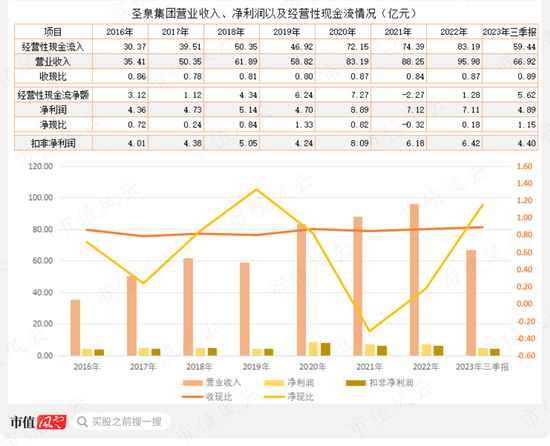 圣泉集团业绩保持较快增长,从2016年的35.4亿元增长到2022年的96亿元,年均复合增长率达18%,净利润、扣非净利润年均复合增长率分别为8.5%、8.2%。