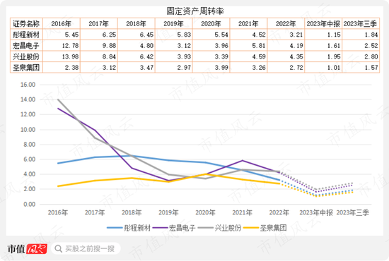 圣泉集团的存货周转率是四家公司中最低的,并且比较稳定,2018年至2022年稳定在5.5次左右,与宏昌电子和兴业股份相比,明显低了很多;今年前三季度,圣泉集团的周转率与彤程新材相当。