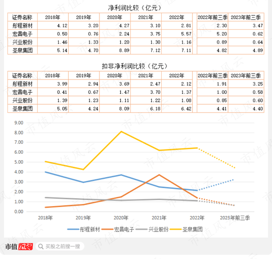 宏昌电子则是短暂增长后快速下滑,兴业股份相对较稳定,扣非净利润每年在1.1亿元上下。