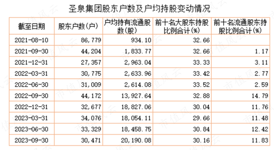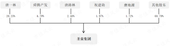 在2021年8月上市时,唐一林、唐地源父子合计持有圣泉集团22%股权,为第一大股东和实控人;截至2023年三季度末,唐氏父子持有上市公司19.5%股权,其中,唐一林担任上市公司董事长,唐地源担任上市公司总裁。