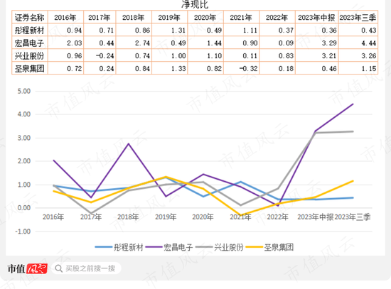 从净现比看,圣泉集团是四家公司中最差的,尤其是2021年、2022年,今年上半年净现比为0.46,到三季度末上升至0.15,说明该公司在三季度经营性现金流净额增加明显。