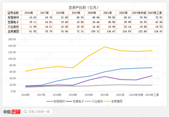 圣泉集团的总资产高于另外三家,2023年三季度末接近125亿元;彤程新材的总资产规模低于圣泉集团,今年三季度接近73亿元;兴业股份的总资产规模最小,今年三季度末不到19亿元。