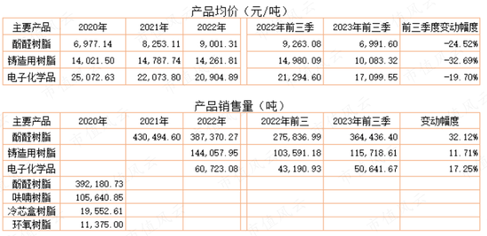 该公司主要产品的价格在今年前三季度下降明显,酚醛树脂价格跌回2020年水平,铸造用树脂、电子化学品两大产品的价格创2020年以来的低位;前三季度主要产品的产量与去年同期相比均有不同程度增长。