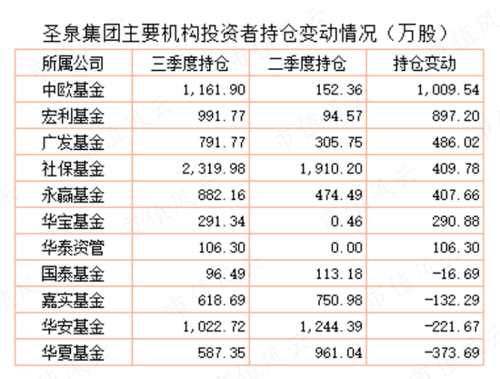 2023年三季度末,中欧基金加仓圣泉集团最多,达1010万股,其次是宏利基金,加仓近900万股,广发基金、社保基金、永赢基金加仓均超过400万股。