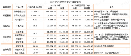 从产能看,彤程新材在特种橡胶助剂与半导体光刻胶的总产能达25.1万吨,宏昌电子在环氧树脂产能15.5万吨,兴业股份目前总产能24万吨。