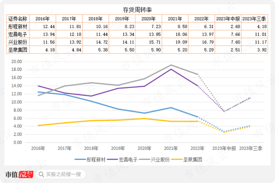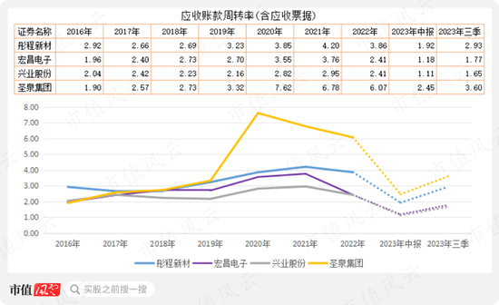 2017年至2019年,圣泉集团的应收账款周转率(含应收票据)与彤程新材比较接近,2020年至2022年明显高于后者,今年前三季度较去年前三季度有所下降,但仍高于另外三家公司。