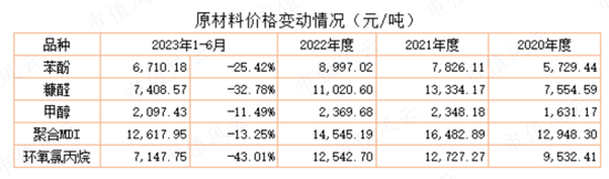 原材料的价格在2020年至2022年均呈现上升态势,但是在今年上半年出现明显下降,苯酚、糠醛、环氧氯丙烷的降幅分别为25%、33%、43%。