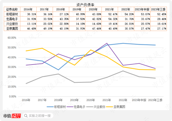 圣泉集团的资产负债率在2021年上市(净募资18.4亿元)后资产负债率明显下降,目前在30%左右,较上市前的2020年下降20个百分点;兴业股份的资产负债率最低,目前在20%左右。