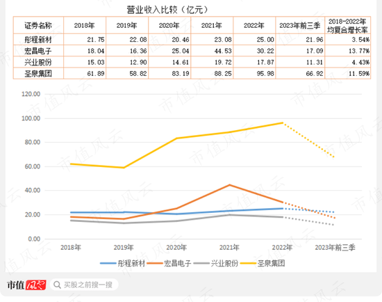 彤程新材与兴业股份的营收规模相对小些,增速也较慢。