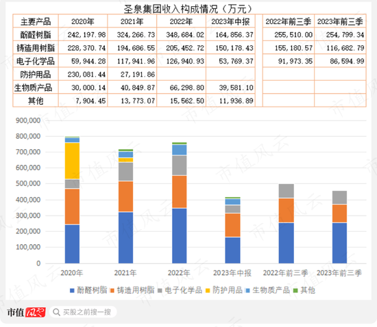 按产品应用方向划分,圣泉集团的业务线包括酚醛树脂、铸造用树脂、电子化学品、防护用品、生物质产品等,其中,酚醛树脂和铸造用树脂是主要业务构成,占总营收的80%以上。