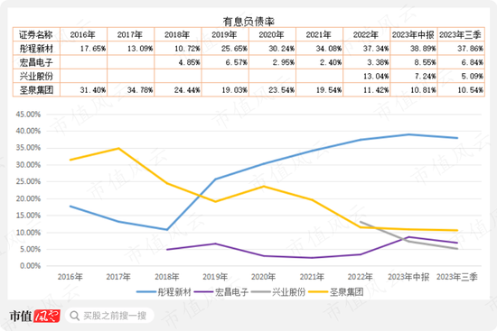 彤程新材的有息负债率最高接近40%水平,圣泉集团自2021年上市后有息负债率下降明显,目前在10.5%水平;宏昌电子与兴业股份两家公司有息负债率均很低,目前在6%上下。