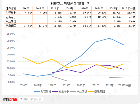 从利息支出与期间费用率的比值看,2020年以来,彤程新材接近或超过20%,而圣泉集团、宏昌电子也是在10%左右。