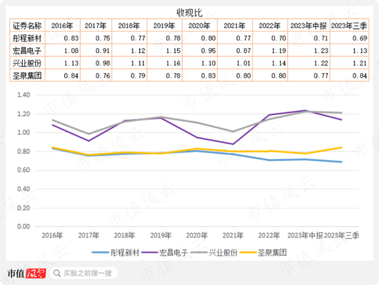 圣泉集团与彤程新材的收现比均不太好,两家公司长期维持在0.8左右;兴业股份的收现比较好,基本保持在1.1以上。