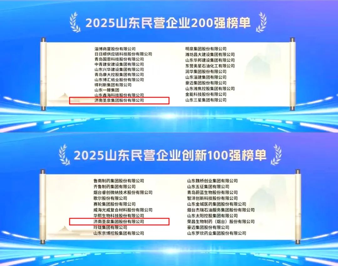8月19日,2025山东民营企业百强系列榜单重磅发布,济南圣泉集团股份有限公司凭借优异的综合实力、创新活力和市场竞争力斩获山东民营企业100强与创新100强双殊荣,分列榜单第70位和第8位。