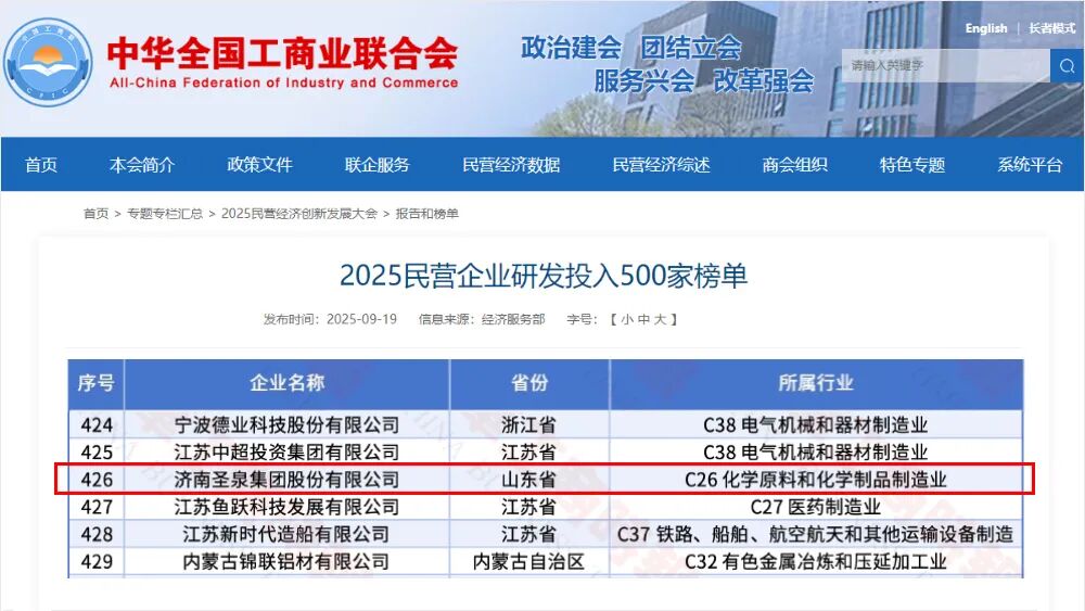 日前,备受关注的“2025民营企业研发投入500家”榜单正式发布,圣泉集团凭借持续强劲的研发投入与卓越的创新能力,成功入围,位列第426位。此次入围是对圣泉集团长期坚持技术驱动、深耕实体经济、以创新引领发展的权威认可与有力印证。