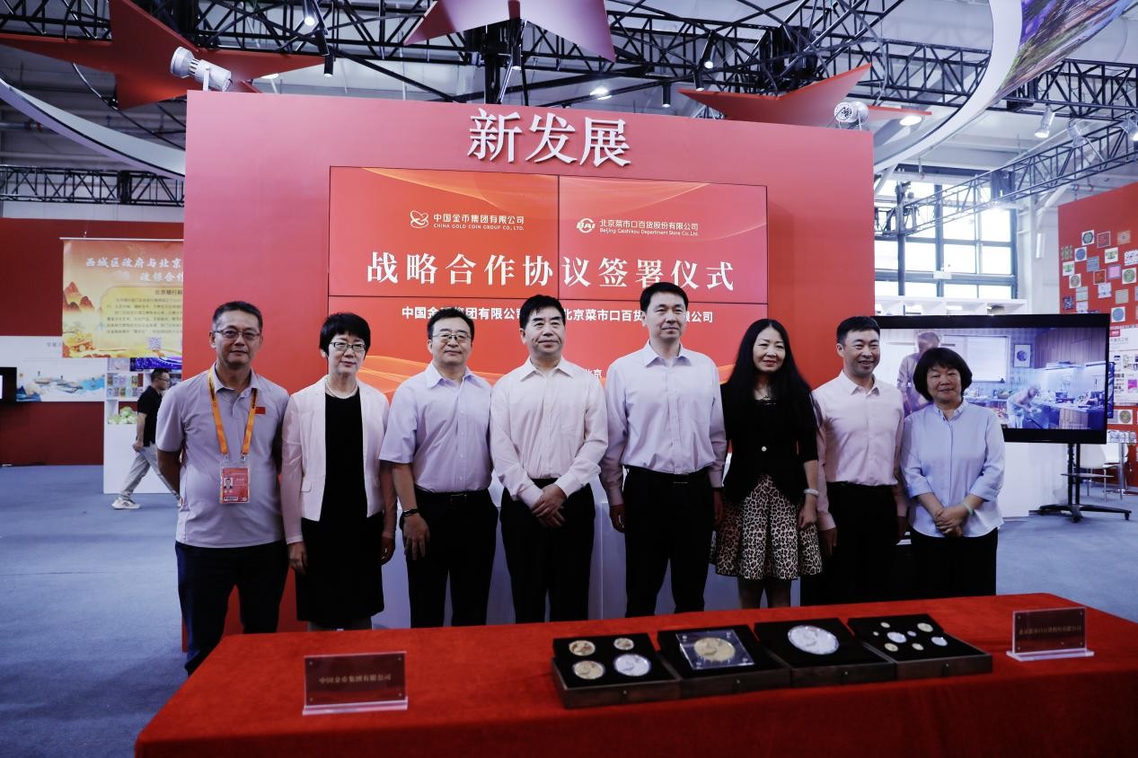 在中国金币集团有限公司党委书记、董事长焦瑾璞、北京市西城区委常委、区政府党组成员、副区长曾林峰,北京市西城区商务局党组书记、局长袁利,北京市西城区国资委党委书记、主任涂云国,北京市西城区文化和旅游局党组副书记、副局长岑运东,金融街资本运营集团党委书记、董事长、总经理程瑞琦的共同见证下,北京开元中国金币经销中心有限公司总经理李波与北京菜市口百货股份有限公司总经理王春利代表双方签署了《中国金币特许渠道战略合作协议》。