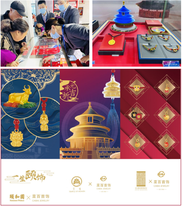 长期以来,菜百股份在老字号创新、品牌文化特色提炼、产品创意研发等方面聚焦融合,诠释了有文化、有情怀的“菜百首饰”品牌内涵。此次北京消博会,菜百股份与天坛、颐和园、首都博物馆等北京文化地标联名开发的“承祈元吉”“一生颐饰”“京城喜饰”等系列国潮文创产品吸引了不少观众的关注,也成为了特色国潮文化“走出去”的新的增长点。系列产品以黄金珠宝饰品为载体,将中华文明精粹的代表元素巧妙地运用于产品中,形成了“品牌化、经典化、艺术化、民族化”的文创精品,让文化“活起来”,令价值“留下来”。