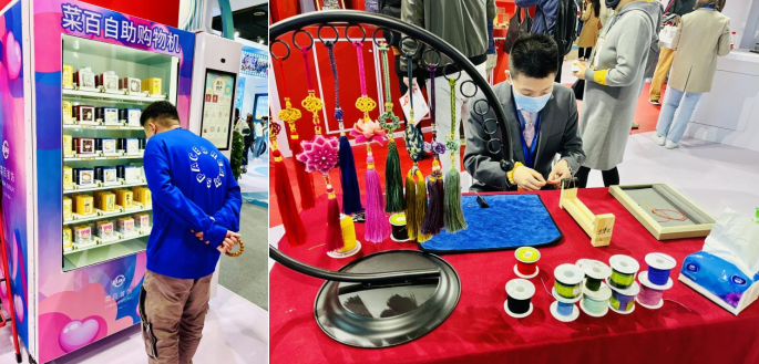 值得一提的是,菜百股份在北京消博会中还展示了数字化转型创新成果。智能奉客盘利用射频读取技术将销售系统转向移动端,实现了丰富的产品展示和快捷的支付收款等工作;自助购物机的使用给顾客带来了更加方便快捷、安全可靠的购物体验;数字人直播通过虚拟人物的呈现和互动,为观众提供了一种全新的娱乐和参与体验。同时也将非遗文化带到了现场,展示中国结艺编织作品,并为观众编织手绳,传递美好祝福。