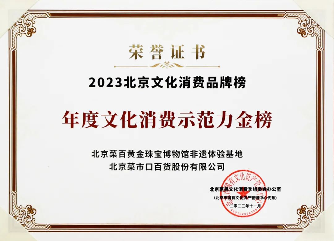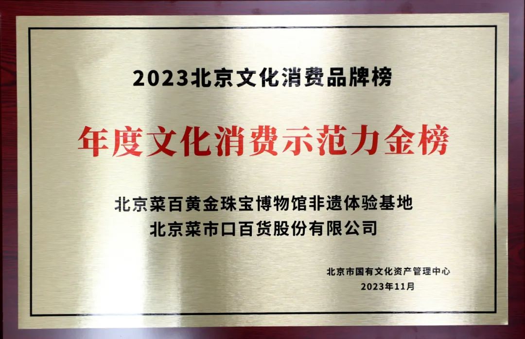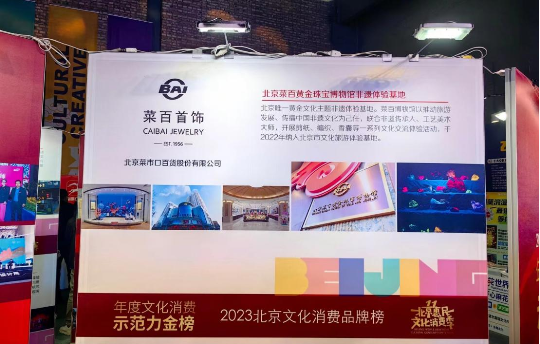 11月21日,北京文化消费论坛暨2023北京文化消费品牌榜发布仪式在751园区圆满举行,北京菜市口百货股份有限公司以北京菜百黄金珠宝博物馆非遗体验基地项目荣登“2023北京文化消费品牌榜——年度文化消费示范力金榜”。
