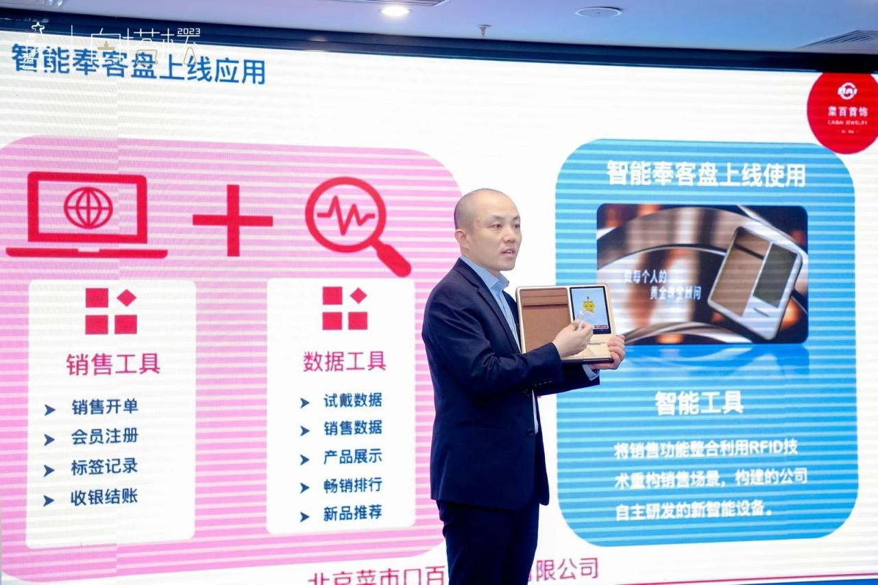 菜百股份开发设计的拥有自主专利和著作权证书的“智能奉客盘”设备是数字化转型创新成果之一。奉客盘利用射频读取技术将销售系统转向移动端,实现了丰富的产品展示和快捷的支付收款等功能,曾在中国黄金协会的技术创新评选中获得一等奖,并被中国上市公司协会评为典型案例,为黄金珠宝零售行业展现了新的数字化方向。