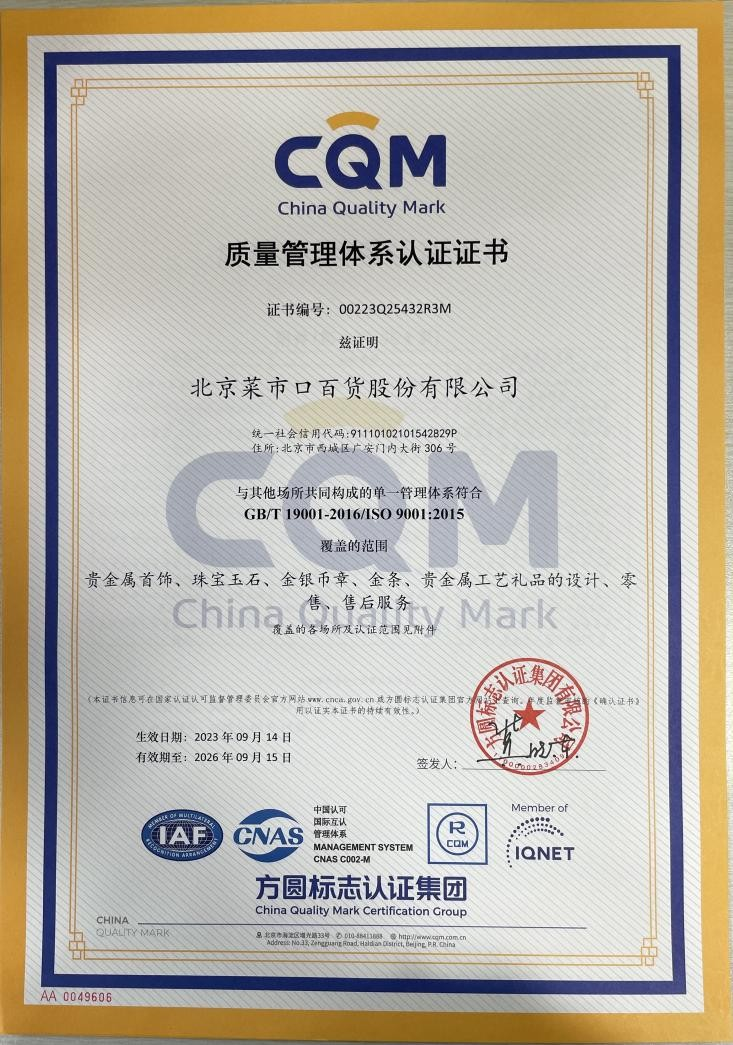 菜百股份始终坚信,只有高质量的产品才能赢得消费者的心。在质量管理方面,菜百股份早在1998年就通过了ISO9000质量体系认证,目前已建立了一套完整的管理规范要求。菜百股份作为上海黄金交易所会员单位,从源头保障了原料质量;在严于国家、行业黄金珠宝首饰相关标准的基础上,制定并完善“菜百首饰”质量标准;制定《供方管理规范》,规范对供方的调查、准入、管理、评价等工作,筛选出优秀的供应商,通过成熟的供应链保证产品质量;制定《黄金珠宝类商品检验规范》,明确多道检验机制;委托国家权威检测机构进行第三方检测,对每一件检测合格的黄金珠宝首饰出具带有防伪标志的检测证明。