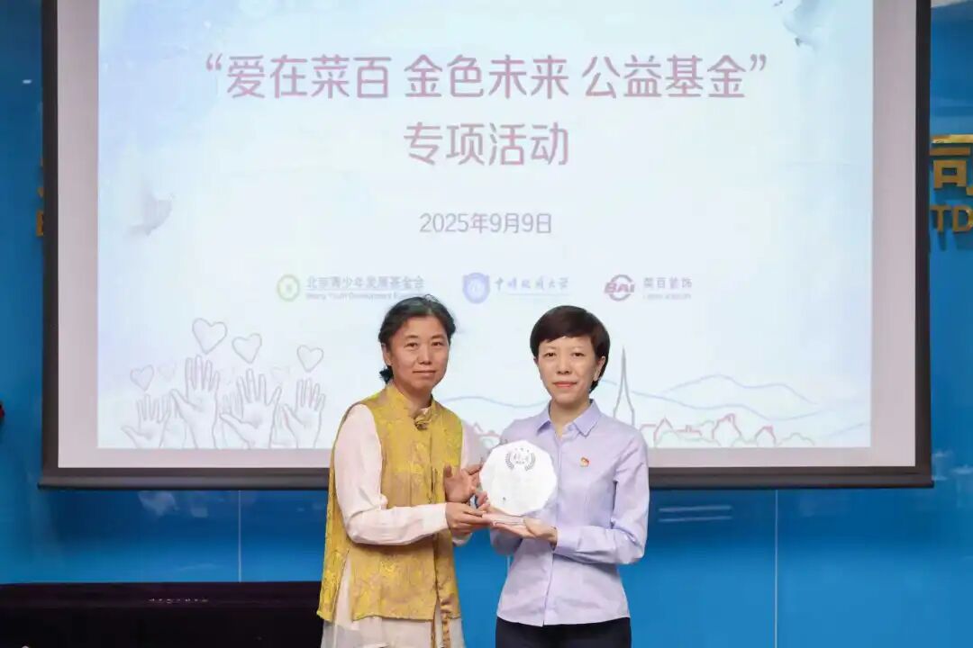 2025年9月9日,时值菜百股份上市4周年、场庆69周年以及教师节来临之际,北京青少年发展基金会副秘书长刘红杰;中国地质大学(北京)党委学生工作部(处)副部长问尧;学生资助中心主任高浮萍;校友与社会合作处办公室主任蒋婷婷;共青团北京市西城区委员会权益部部长任少岚。菜百股份党委书记、董事长谢华萍;党委委员、常务副总经理李沄沚;副总经理杨娜;团委副书记、总经理助理张宇等相关方领导,携手开展“爱在菜百金色未来专项基金”公益活动,共同践行公益,见证善举。