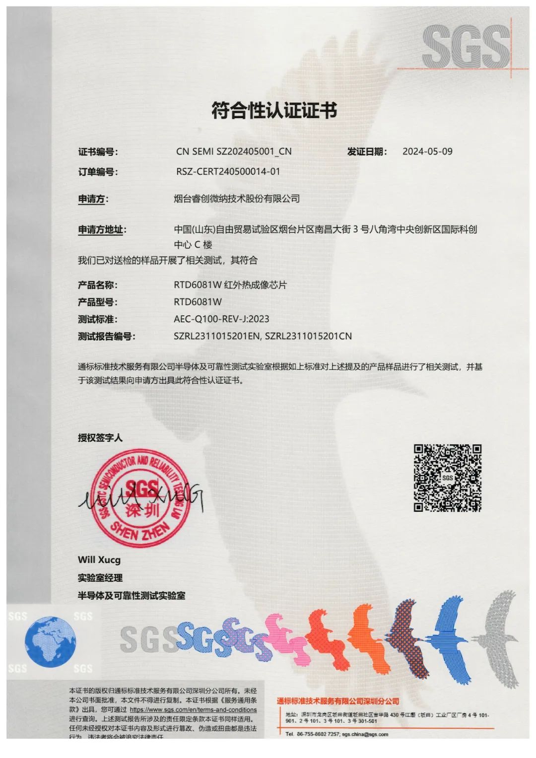 继RTD6122W系列芯片、LY300芯片通过AEC-Q100认证后,睿创微纳自主研发的RTD6081W系列8微米非制冷红外热成像芯片也成功获得了AEC-Q100这一汽车行业的权威认证。