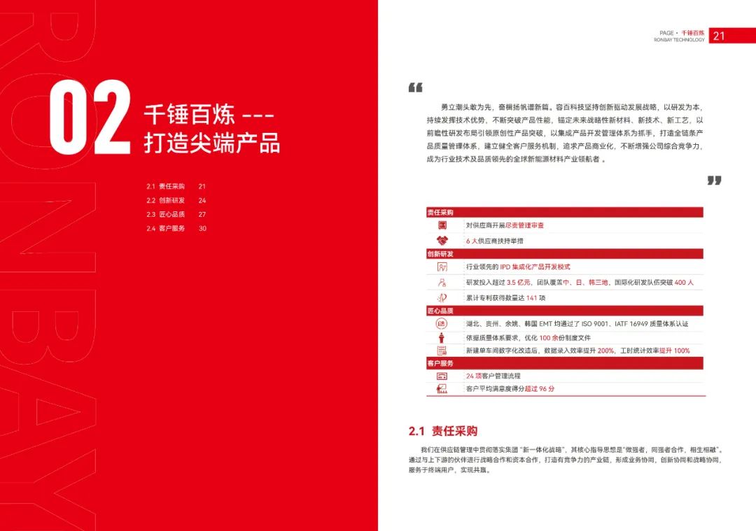 勇立潮头敢为先,奋楫扬帆谱新篇。容百科技坚持创新驱动发展战略,以研发为本,持续发挥技术优势,不断突破产品性能,锚定未来战略性新材料、新技术、新工艺,以前瞻性研发布局引领原创性产品突破,以集成产品开发管理体系为抓手,打造全链条产品质量管理体系,建立健全客户服务机制,追求产品商业化,不断增强公司综合竞争力,成为行业技术及品质领先的全球新能源材料产业领航者。