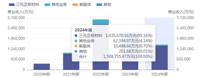 量增价跌共同效应下,公司正极材料全年实现营收143.57亿元,同比下降31.53%,在公司营收中占比95.16%。