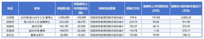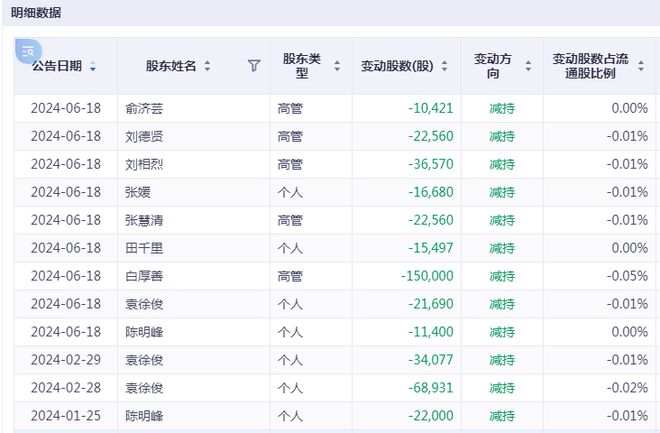 2024年6月,因限制性股票回购注销,白厚善、刘相烈、刘德贤、张慧清、俞济芸五位高管合计减持公司股票约24.21万股,其中白厚善减持股数最多,为15万股。