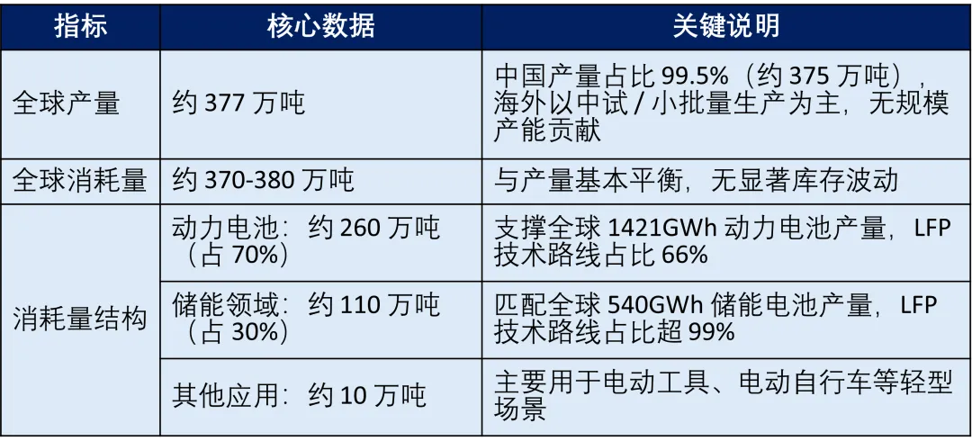 2025 年全球磷酸铁锂(LFP)正极材料产量、销量及消耗量合并简表