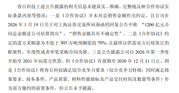 一是《合作协议》并未对总销售金额作出约定,且公司在2026年1月19日关于对上海证券交易所问询函的回复公告中称“1200亿元合同总金额是公司估算得出”,“销售金额具有不确定性”。