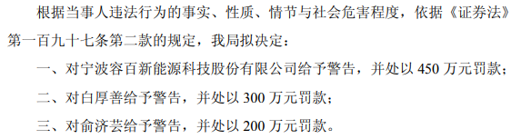 宁波证监局拟决定对容百科技给予警告,并处以450万元罚款;对白厚善给予警告,并处以300万元罚款;对俞济芸给予警告,并处以200万元罚款。