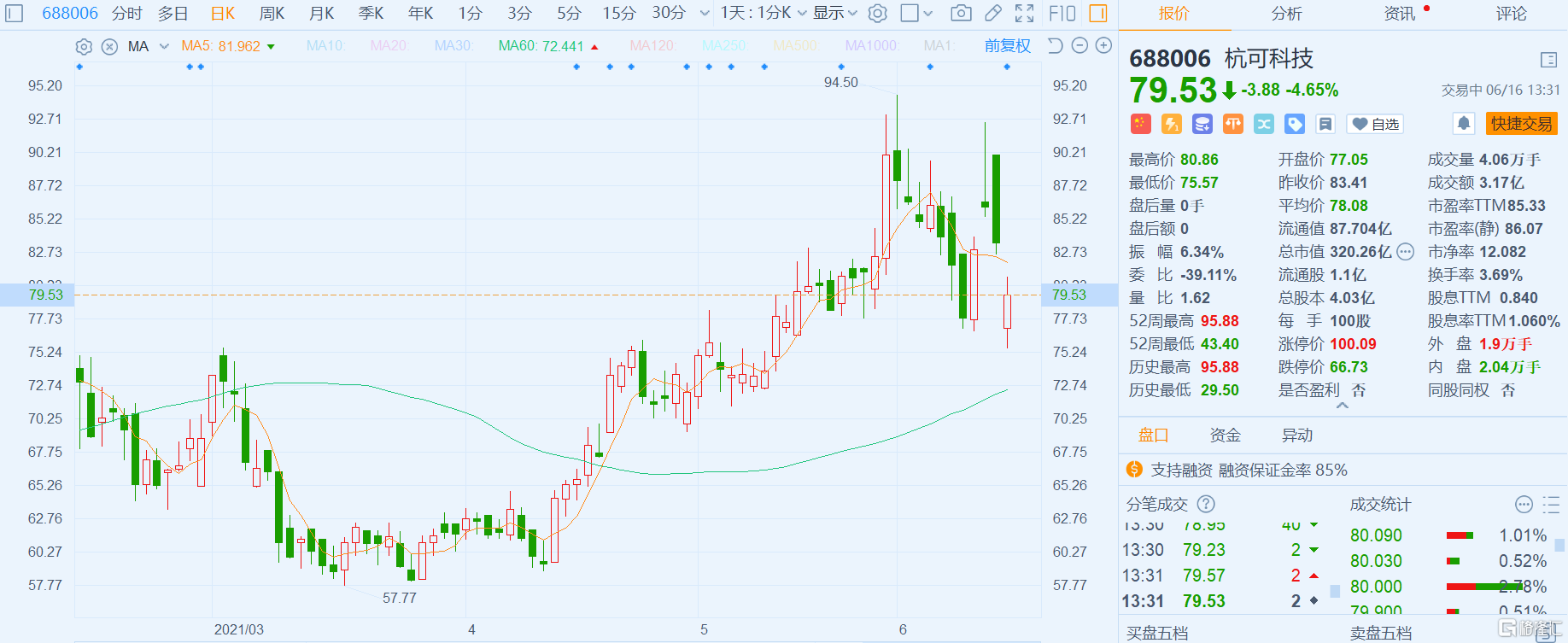 杭可科技(688006.SH)今日大幅低开约7.6%,现跌幅收窄至4.65%,报79.53元,总市值320亿元。杭可科技昨日公告称,5月17日公司收到宁德时代通过邮件发送的订单PO(简称“原合同”),共计4.8亿元(不含税),公司于5月18日确认后,原合同生效。因原合同技术协议发生变更,公司于2021年6月11日收到宁德时代通过邮件发送的《PO变更通知单》,经双方友好协商,公司于2021年6月15日同意并予以盖章回传。《PO变更通知单》是双方约定的合同变更或取消的方式,本次《PO变更通知单》的内容主要是双方同意解除2021年5月18日签订的原合同。