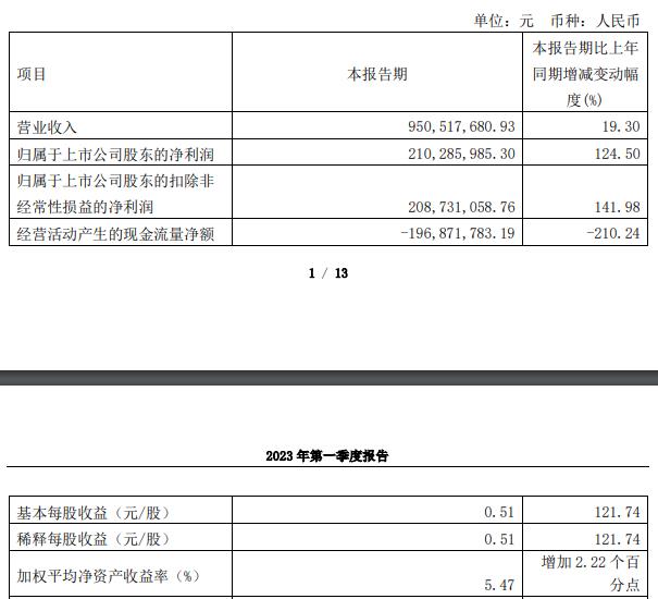 杭可科技2023年第一季度报告显示,2023年一季度,杭可科技实现营业收入9.51亿元,同比增长19.30%;归属于上市公司股东的净利润2.10亿元,同比增长124.50%;归属于上市公司股东的扣除非经常性损益的净利润2.09亿元,同比增长141.98%;经营活动产生的现金流量净额-1.97亿元,同比下滑210.24%。
