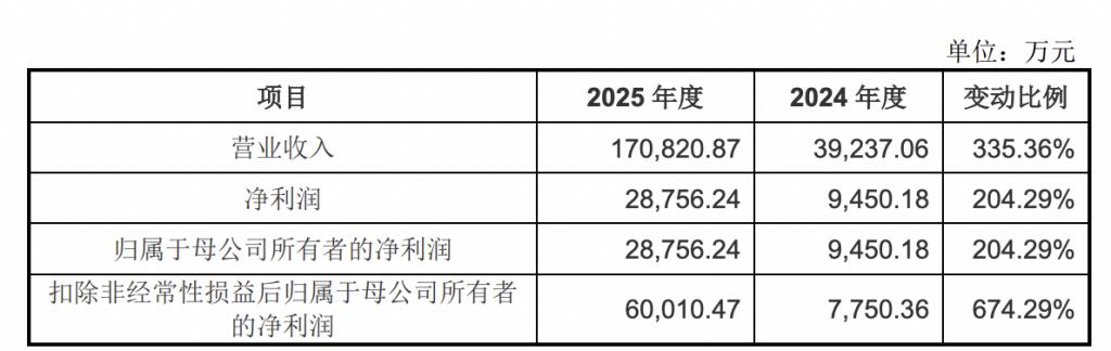 2025 年,公司营业收入为 17.08 亿元,同比增长 335.36%;净利润为 2.88 亿元,同比增长 204.29%。