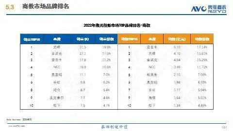 近日,奥维睿沃(AVC Revo)发布2022年《中国大陆激光投影市场研究报告》。报告显示,2022年中国激光投影工程市场和商教市场,光峰科技都获得销量市场份额第一。