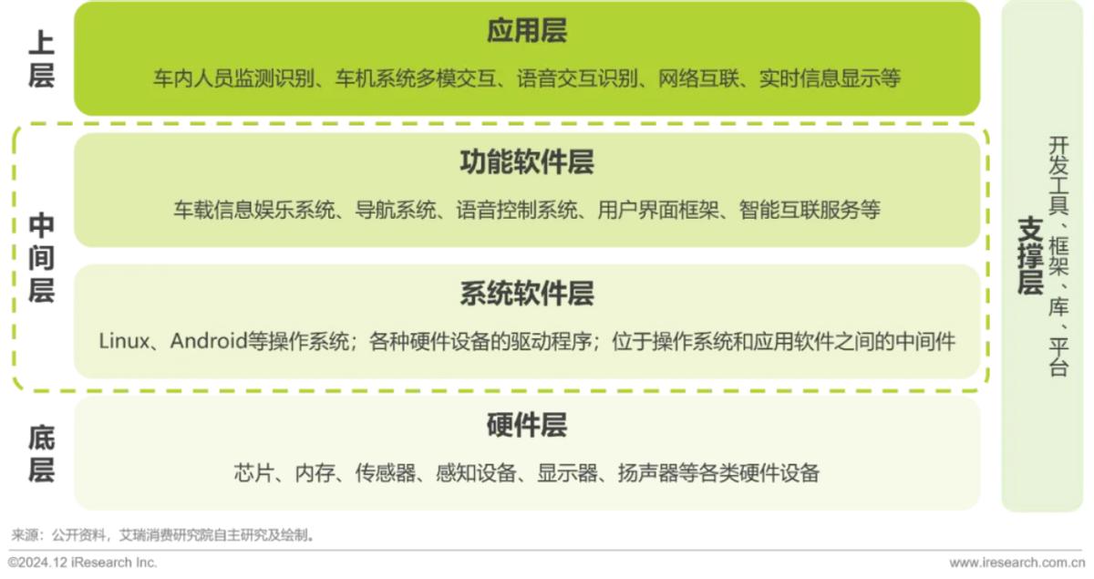 行业相关机构的调研显示,智慧座舱是当前车辆技术创新和体验创新的关键生态位。艾瑞咨询在研究报告中指出,硬件层、中间软件层、应用层紧密配合,共同实现了智能座舱的各项功能。每个层级都涵盖丰富的功能点,这意味着光峰科技等供应商可以从特定功能点和配置切入,为智慧座舱带来全新的体验。