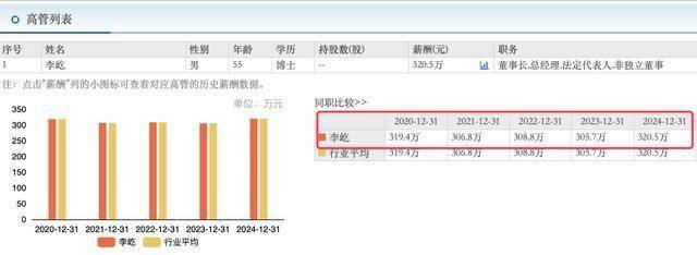 从东方财富提供的数据来看,李屹在近年来的薪酬相对稳定,2020年至2024年分别为319.4万元、306.8万元、308.8万元、305.7万元和320.5万元。尽管公司利润大幅下滑,但李屹的薪酬并未受到显著影响。