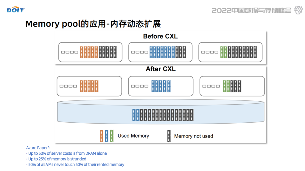 这部分的内存没能很好地发挥它的价值,如果用CXL来做池化,这意味着单节点服务器可以部署较少的内存,大部分的内存可以从服务器当中解耦出来,通过CXL技术,形成一个内存池,连接到多个服务器上。