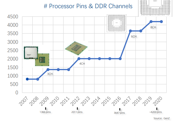 以往的做法中,就是在处理器当中增加内存通道,从上图可见,处理器支持的内存的通道数,从早期的3通道、4通道,发展到了现在的6个内存通道、8个内存通道,将来的处理器还会支持12个内存通道。