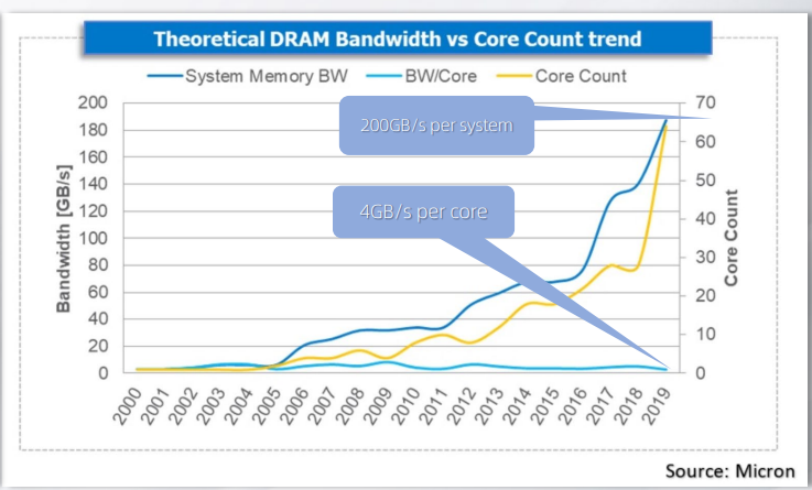 从带宽来看,虽然整机的内存总带宽是在不断提升,但是相对于核心数来说,每个核心上面的内存带宽提升并不明显。