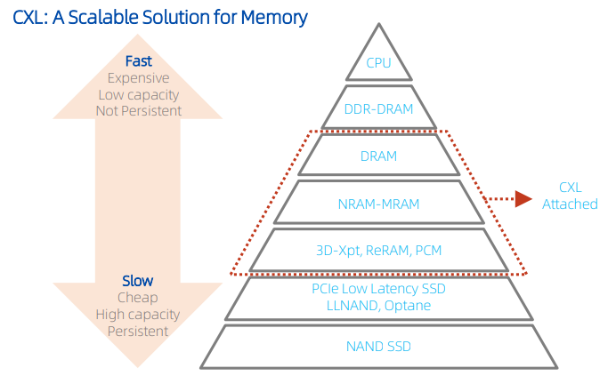 如上图所示,它可以把不同的成本,不同性能的存储介质,通过CXL的接口连接到系统当中。