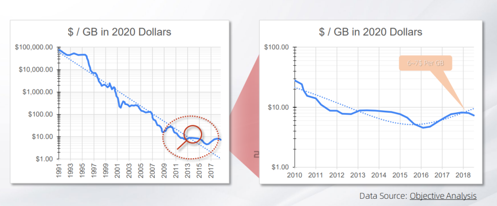 从内存成本发展的趋势来看,过去十几二十年来,随着DDR内存的发展,单位内存的成本在不断下降。但近几年来,下降的趋势变得更平缓了。