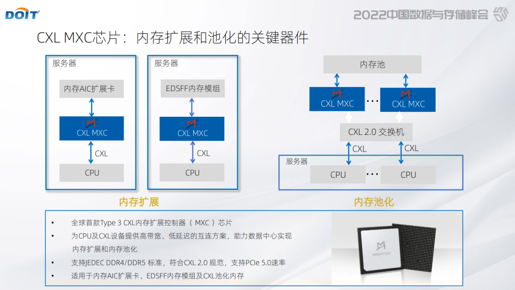MXC兼容CXL 1.1和2.0的规范,支持标准的DDR4和DDR5接口,可以广泛地应用在不同的模组类型上。比如传统的PCIe卡的形式,或者是新型的EDSFF的形态,或者服务器的背板。