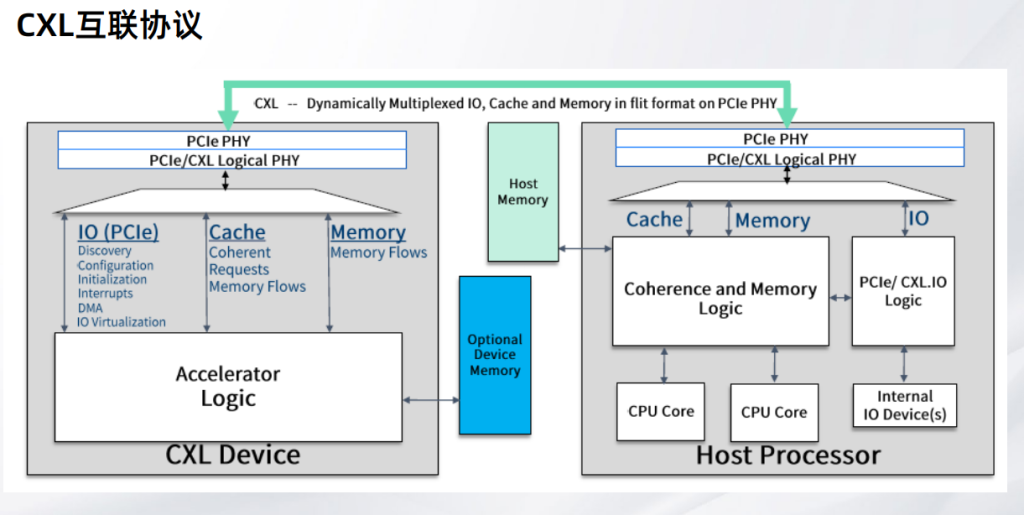 从上图可以看到CXL与主机的连接方式,以及它在系统的体系当中的位置。