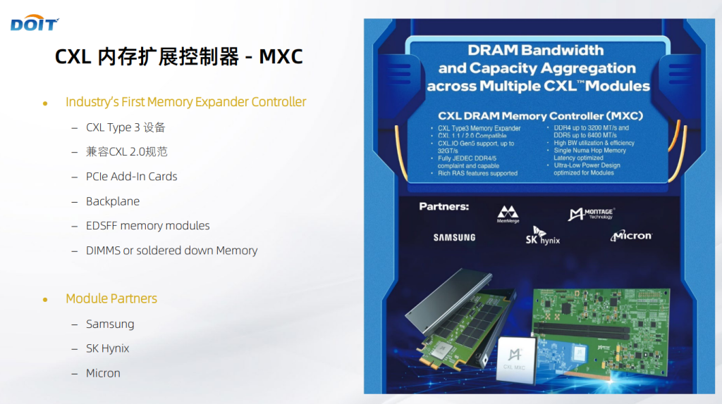 MXC支持标准的DIMMS内存条,也可以支持内存Onboard的设计。澜起科技在很早之前就跟业界主流的DRAM厂商、平台厂商,像MemVerge这样的软件方案厂商展开合作,来共同推动CXL生态的发展。