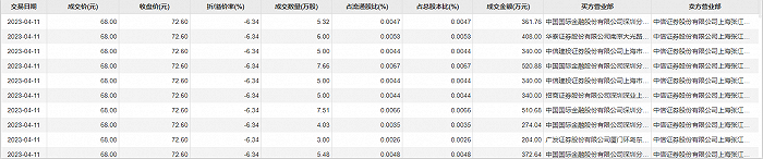 澜起科技4月11日大宗交易成交54万股,成交额3672万元,占当日总成交额的1.9%,成交价68元,较市场收盘价72.6元折价6.34%。
