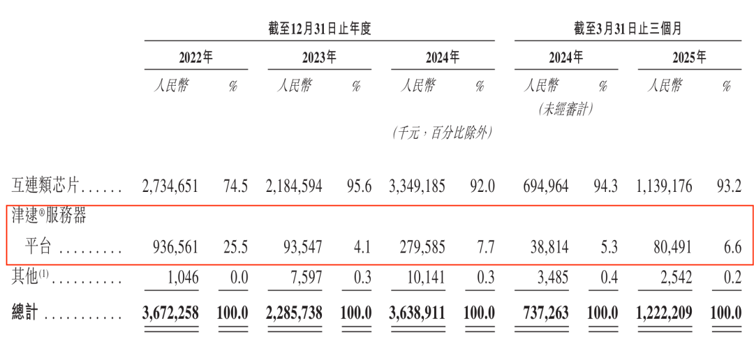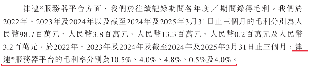 2022年至2025年一季度,津逮?服务器平台贡献的收入占比为25.5%、4.1%、7.7%、6.6%;毛利率为10.5%、4.0%、4.8%、4.0%,整体均呈现下滑趋势。